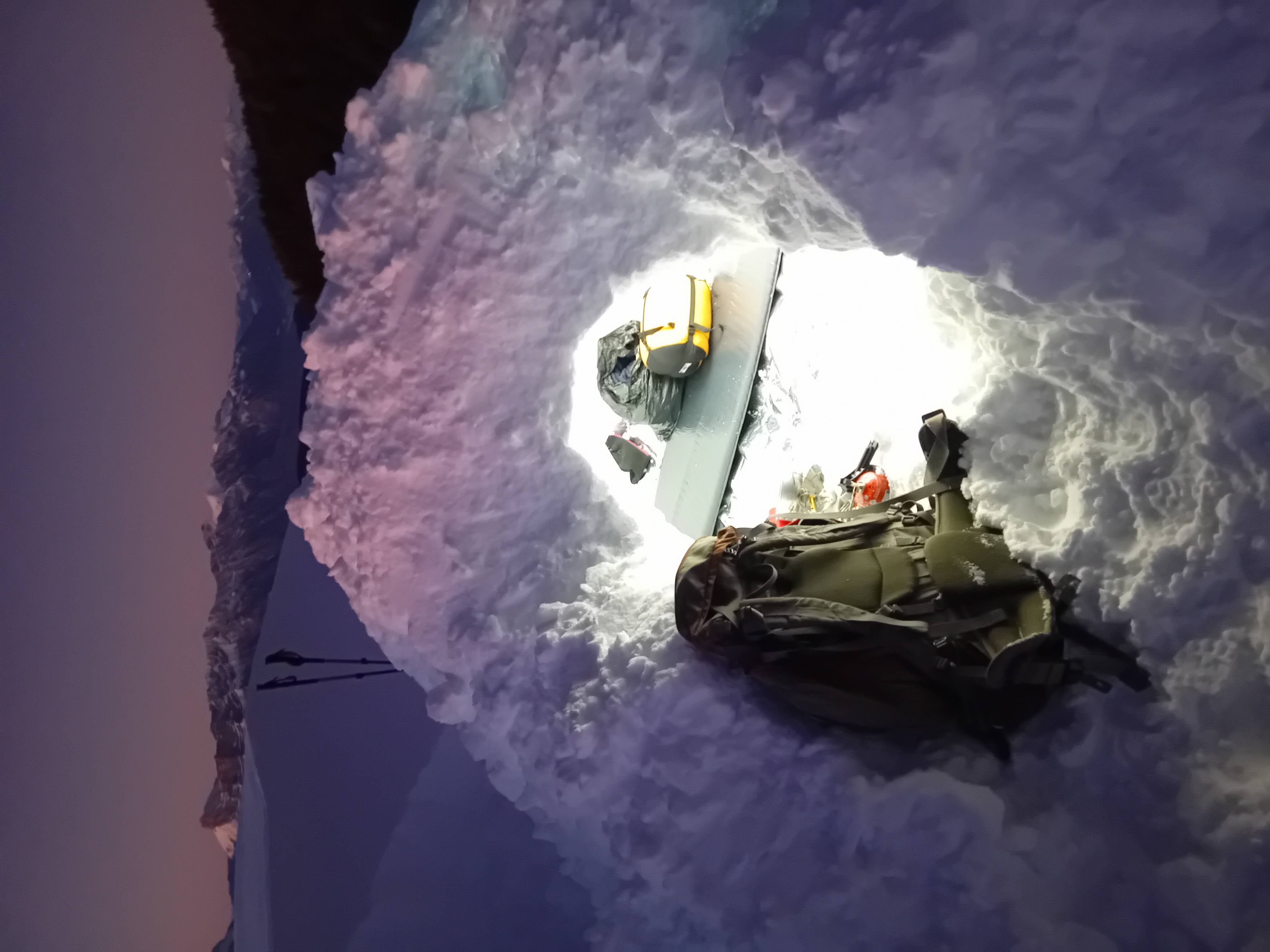 - en cas de grosses chutes de neige très légères et froides, sans beaucoup de sous-couches de neige plus dense. Même si le paysage sera celui d’une carte postale, une neige trop froide et légère est très difficile à densifier, ce qui rendra la construction de votre abri bien plus longue et délicate. Ce n’est pas impossible, mais il faut le prendre en compte dans le planning de l’étape. Par contre, le point positif, c’est que vous serez beaucoup moins mouillé à la fin de l’opération, vu que la neige est plus « sèche ».